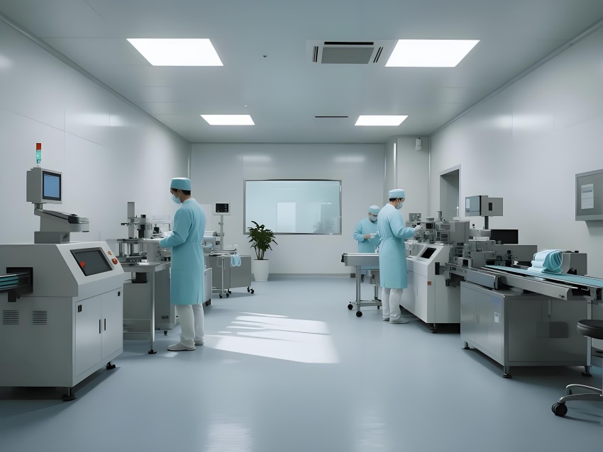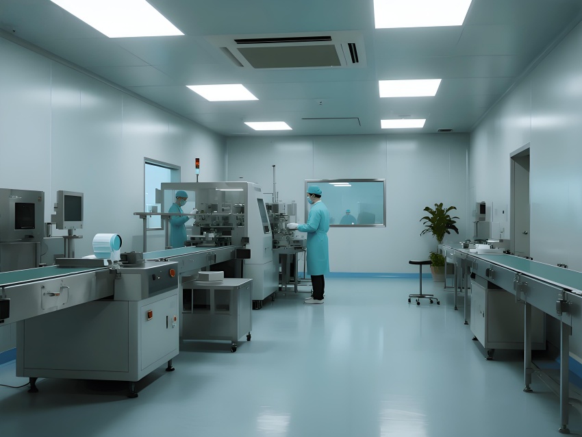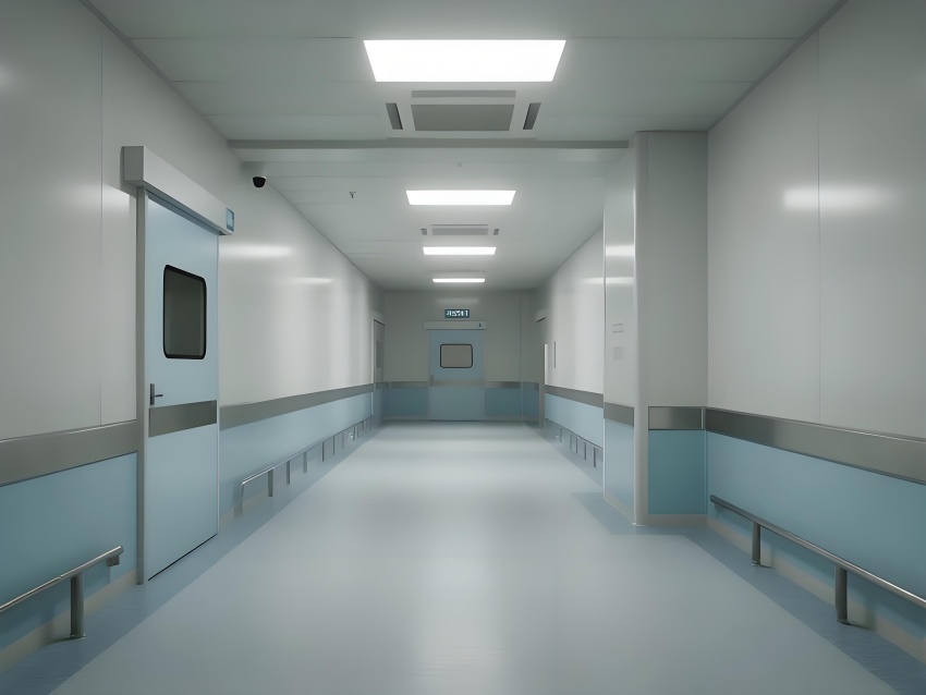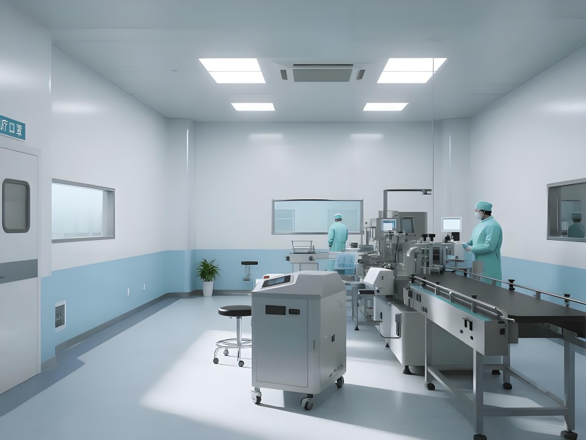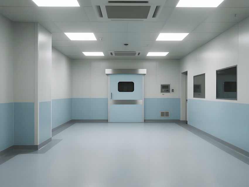 地面采用防静电环氧自流平,耐磨无缝隙且易清洁;墙面为50mm厚抗菌彩钢板,圆弧角处理避免积尘;顶面配置一体化铝扣板吊顶,内置FFU空气过滤单元,与LED平板灯形成均匀照明。