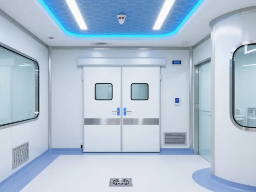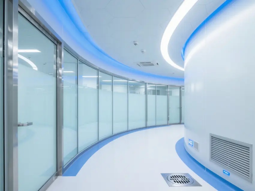 车间内设有多个玻璃门和窗户,既保证了空间的通透感,又便于观察内部情况。天花板上安装了多盏方形的照明灯,提供充足的光线,同时还有通风设备,确保空气流通。
