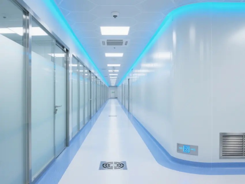 整个车间以白色为主色调,搭配蓝色的灯光装饰,营造出一种干净、专业且略带科技感的氛围。地面和墙面都采用了光滑的材质,便于清洁和保持卫生。