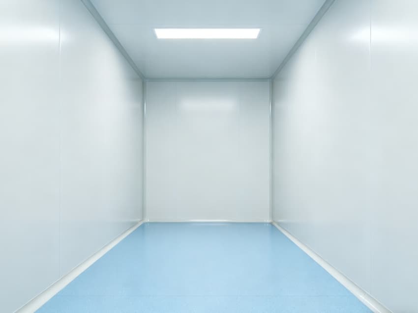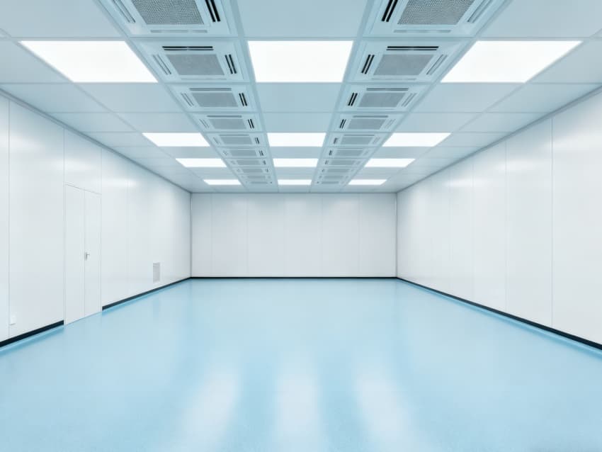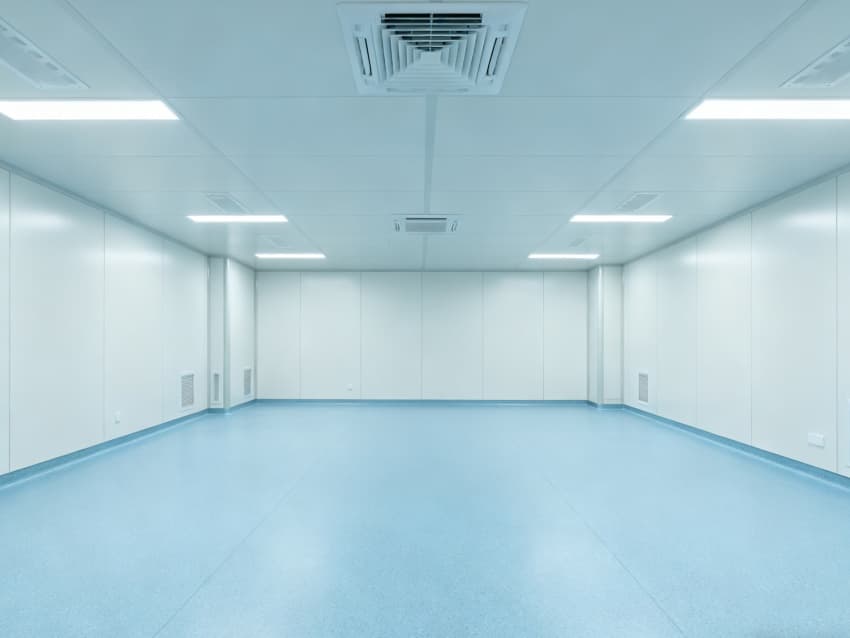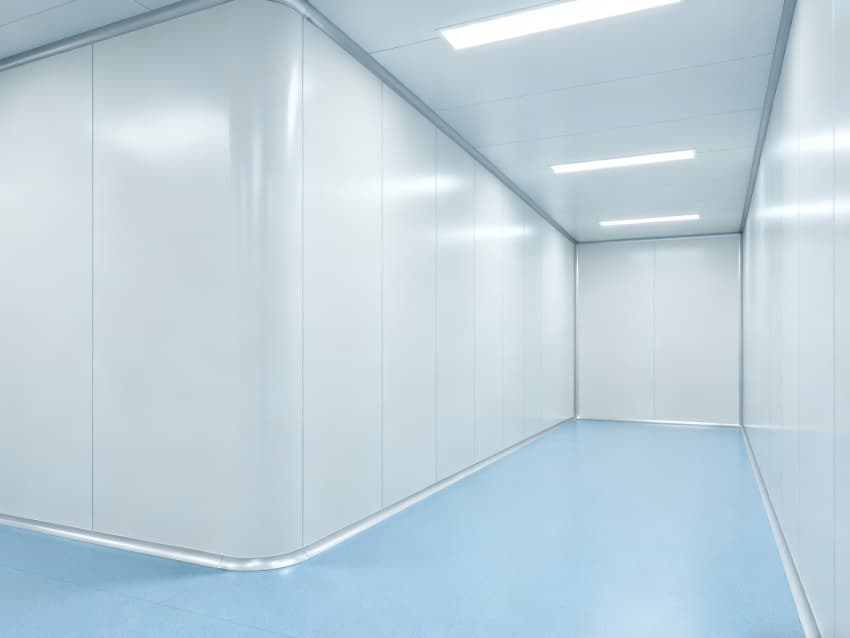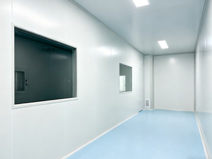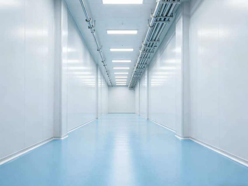 内部按功能划分为六大洁净区域:核心洁净生产区(浅蓝色防滑防霉地面)预留开阔空间,满足发酵罐、纯化设备等后期安装;顶部洁净送风区通过规整风阀系统,实现万级洁净度均匀送风;墙面过渡区采用圆弧转角设计,避免粉尘堆积;密闭观察区设双层钢化观察窗,兼顾生产监控与无菌隔离;纵向设备预留区保留8米净高,适配大型冻干设备动线;辅助缓冲区衔接车间入口,搭配风淋系统,实现人员/物料洁净过渡。整体空旷布局既保障洁净操作空间,又满足皖北生物制药企业灵活扩产需求,为本地药企提供合规、高效的生产载体。
