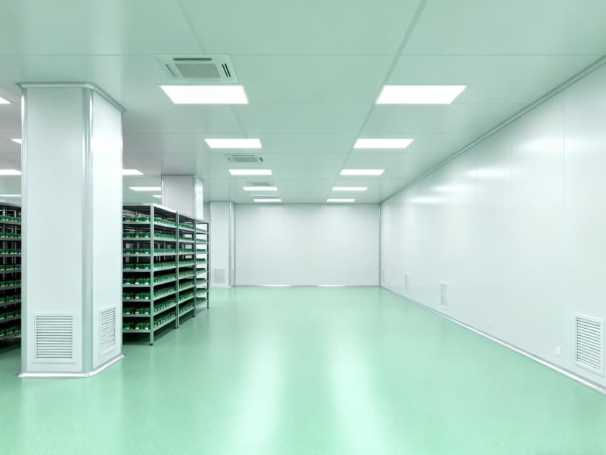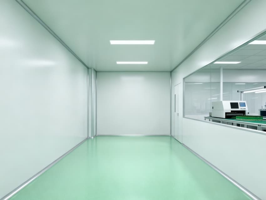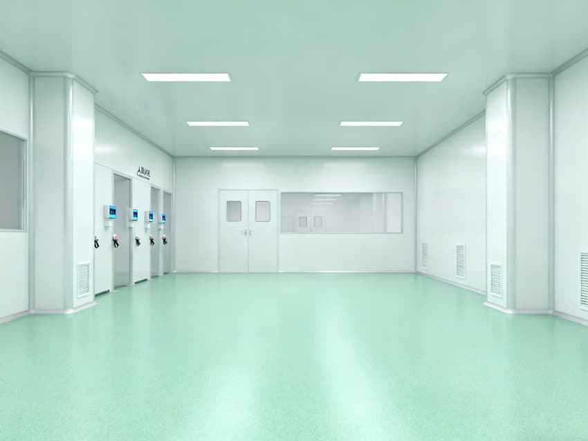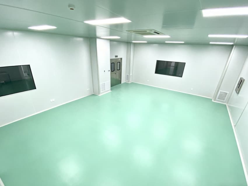 设计在环境防护上针对性突出:地面采用浅绿色防静电环氧材质,表面电阻值控制在10^6-10^9Ω,有效规避静电对电子零件的损伤;四周白色防尘墙壁经哑光处理,减少光线反射干扰,配合顶部高效空气过滤器(HEPA),可稳定维持千级洁净度,隔绝粉尘、微粒对精密组装的影响。