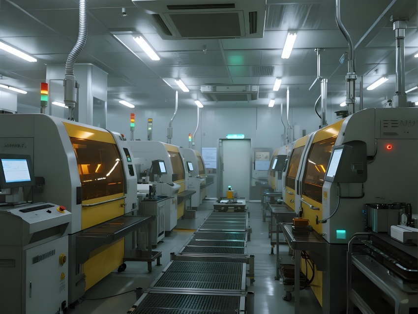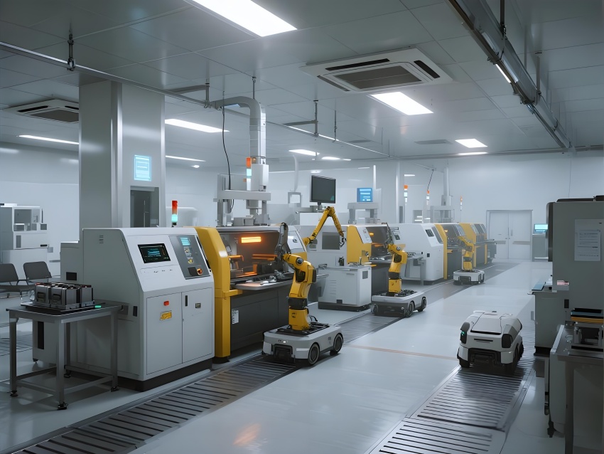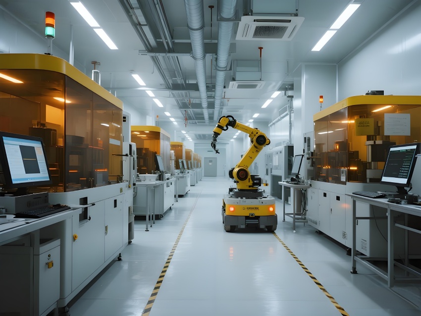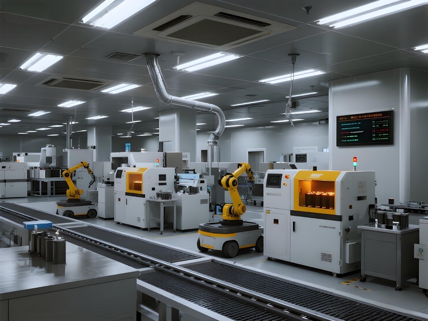 本车间以“精密制造+极致洁净”为核心,采用未来工业风设计,主色调为冷银灰与警示黄,强化功能分区。顶棚矩阵式FFU单元配合地面格栅回风,形成垂直层流,蓝色气流轨迹可视化突显洁净度。电极区配备全封闭涂布机,机械臂精准运作;电芯装配区采用防静电工作台,激光焊接火花与冷色调环境形成对比。注液区全封闭氮气手套箱搭配琥珀色警报灯,确保绝对干燥。化成区排列着智能温控柜,数据看板实时监控电池参数。AGV机器人沿磁轨穿梭,与悬吊式管道系统构成高效物流网络。整体空间融合精密机械的冷峻美学与智能制造的科技感,打造高可靠性的锂电池生产环境。