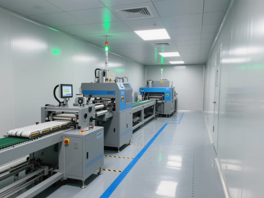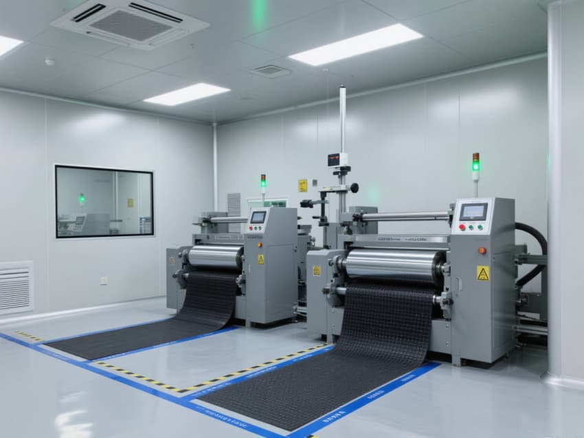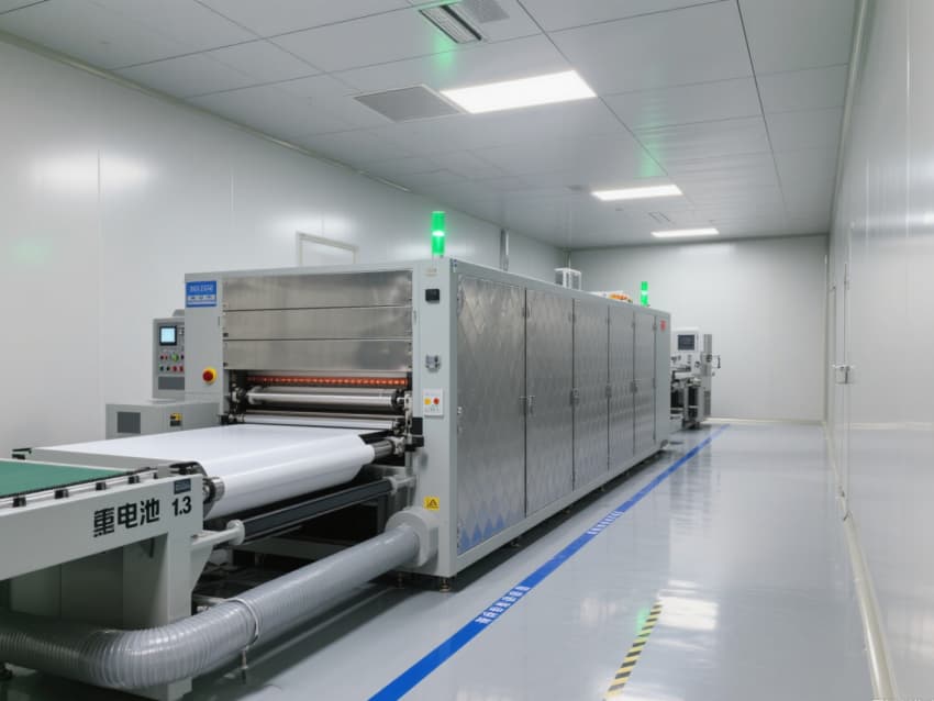 车间以银灰色抗菌金属彩钢板搭建墙体与吊顶,搭配浅灰色防静电环氧地坪,金属质感的建材兼具抗电解液腐蚀、易清洁特性,地面蓝色防静电标识线清晰划分涂布、卷绕、装配等工序区域。顶部高效过滤器与定向层流系统,实现每小时18-22次空气置换,配合除湿机组将湿度精准控制在20-30%RH,避免水分影响电芯性能。