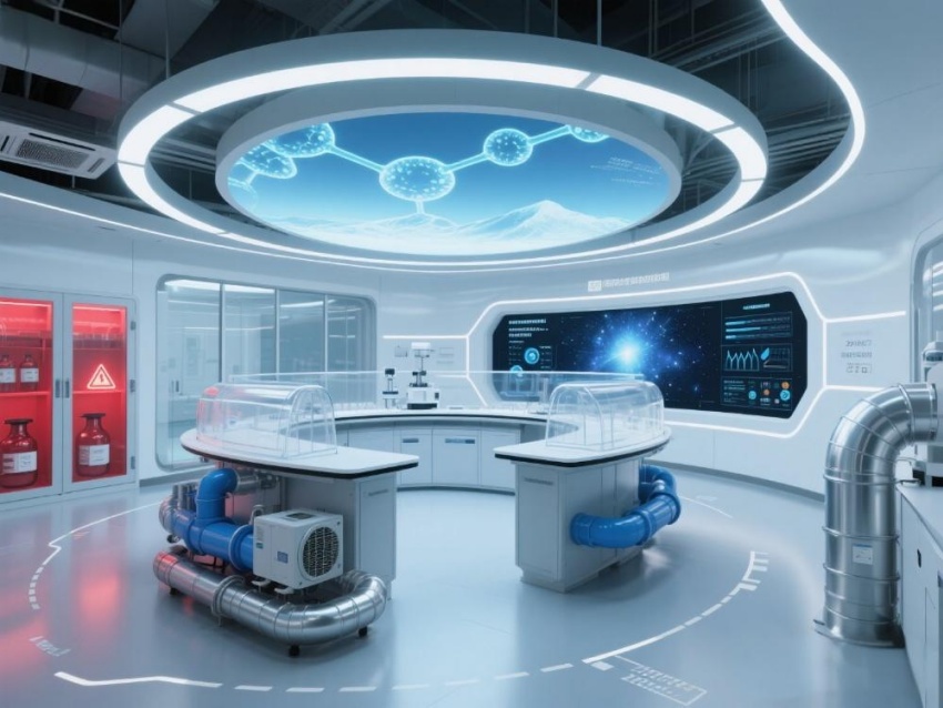 本实验室以"绝对环境控制"为核心设计理念,整体采用冰川蓝与钛白灰的渐变配色。墙面嵌入式环境参数监测屏实时流动着翡翠绿数据流,与顶棚矩阵排列的微孔送风口形成科技韵律。核心实验区采用圆弧形防结露玻璃隔断,内置百级洁净层流罩。地面铺设防静电陶瓷钢板,接缝处嵌入LED环境达标指示灯。设备区裸露的银色保温管道与蓝色冷媒管构成工业美学展陈,智能除湿机组通过半透明外壳展示内部冷凝过程。数据中控室配备270°曲面监控屏,悬浮粒子浓度以动态星云图呈现。空间通过严谨的几何分割与流体力学曲线结合,在极致环境控制要求下,打造出兼具科研严肃性与星际舱未来感的顶级实验环境。