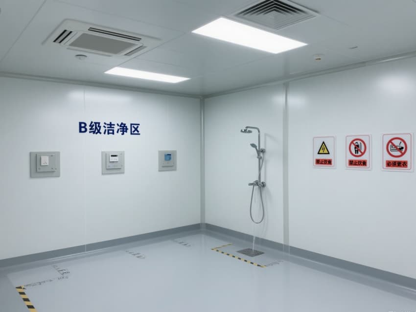 车间严格遵循万级洁净标准,每立方米空气中≥0.5μm微粒数≤35.2万个、菌落数≤10个。白色抗菌彩钢板搭建的墙体与吊顶,具备抗菌、耐腐蚀、易消毒特性,墙面与地面的圆弧过渡设计彻底消除卫生死角;浅灰防静电环氧地坪则通过防静电处理,避免静电干扰生物活性物质。