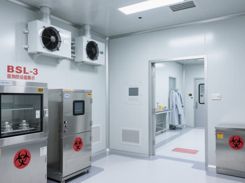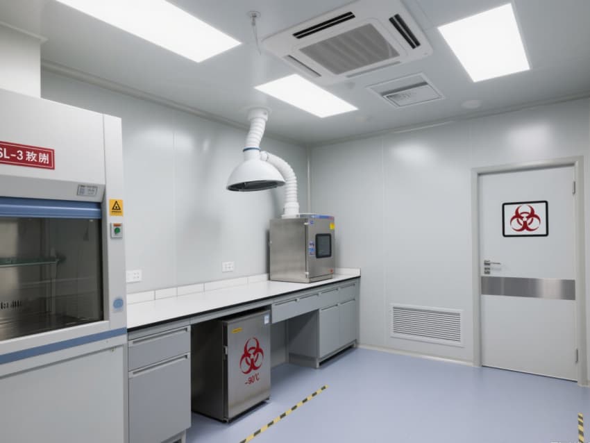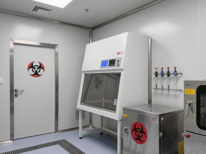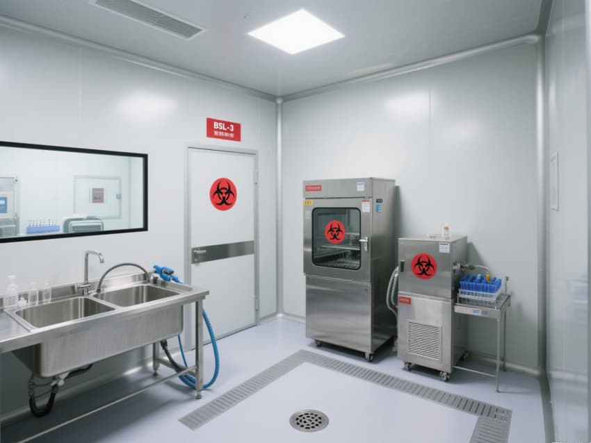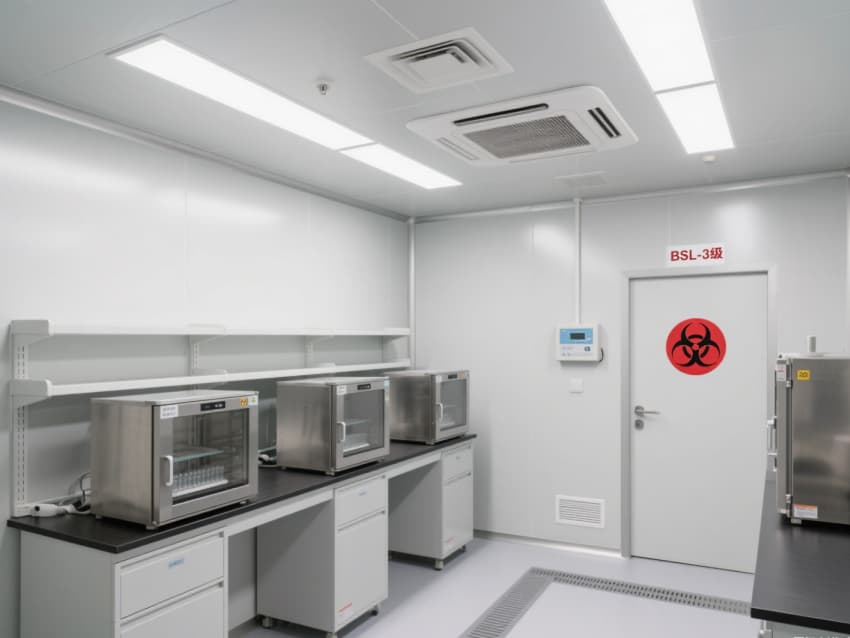 实验室核心区域配备负压生物安全柜、双扉高压灭菌器,确保微生物操作与废弃物处理安全;顶部高效空气过滤器(HEPA)实现每小时15-20次空气置换,尾气经消毒处理后排放,避免气溶胶扩散。互锁式洁净门、双层钢化玻璃观察窗与应急喷淋装置,形成全流程安全保障。