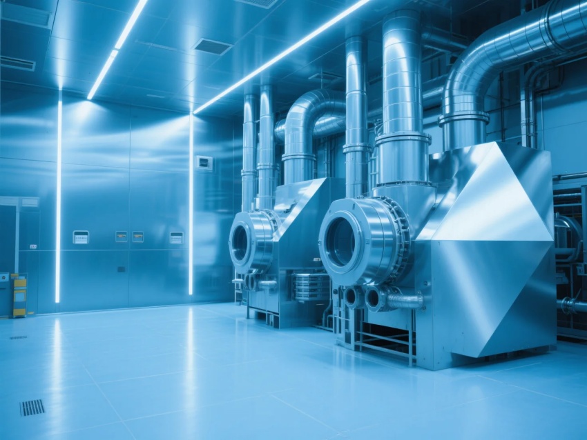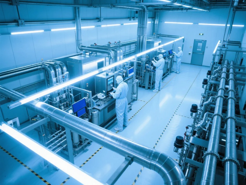 本百级车间采用"超净工业未来主义"风格,符合ISO14644-1Class3标准(≥0.1μm颗粒≤1,000/m³)。设计核心突破: