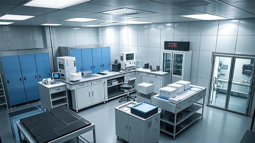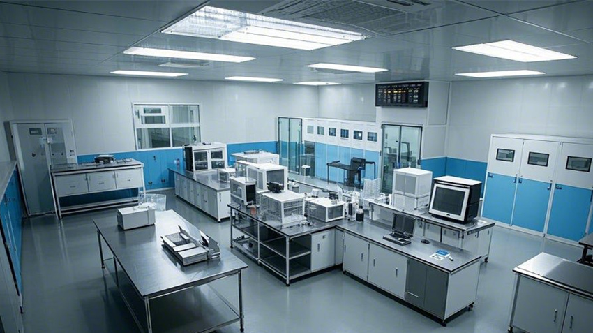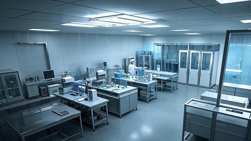 1000平方米电子无尘车间,现代科技风格,干净整洁,光线明亮。核心生产区占70%,辅助区占20%,办公区占10%。核心生产区:防静电环氧地坪(浅灰色),白色彩钢板墙面和天花板,垂直层流气流,顶部高效过滤器(HEPA),不锈钢工作台,设备排列整齐。辅助区:更衣室(浅蓝色墙面,衣柜和长凳),风淋室(透明玻璃门,不锈钢墙面),物料缓冲间(传递窗,白色墙面)。办公区:玻璃隔断,现代简约办公桌,防静电PVC地板(浅色),LED面板灯。整体色彩:白色、浅灰色、科技蓝点缀。