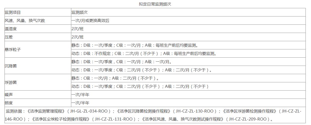 监测依据:《洁净监测管理规程》(JH-GL-ZL-034-ROO);《洁净区沉降菌检测操作规程》(JH-CZ-ZL-130-ROO);《洁净区浮游菌检测操作规程》(JH-CZ-ZL-146-ROO);《洁净区尘埃粒子检测操作规程》(JH-CZ-ZL-131-ROO);《洁净区风速、风量、换气次数测试操作规程》(JH-CZ-ZL-209-ROO)。