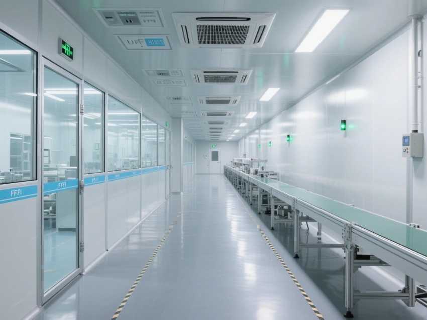 生产线配备全自动晶圆传送机械臂、激光焊接设备,透明防尘罩与实时粒子计数器确保工艺稳定性。走廊设置防静电地板与人员净化通道,风淋时间严格控制在30秒,全方位满足微电子元件的超高洁净生产需求。