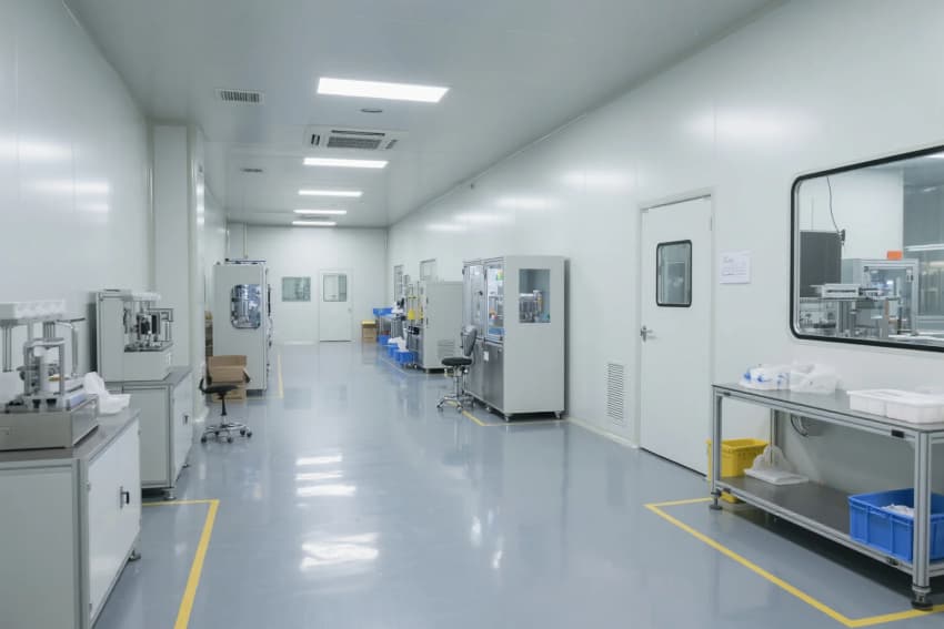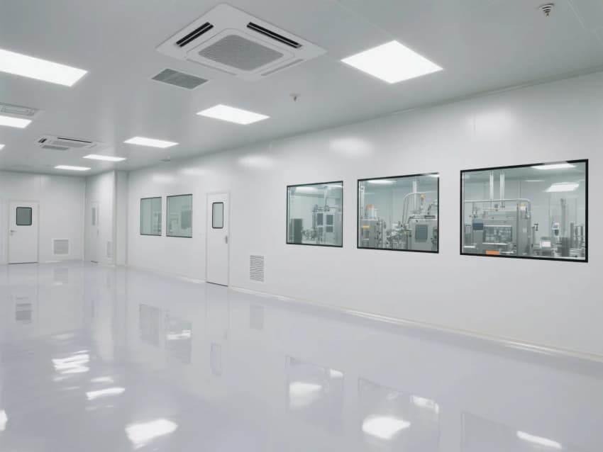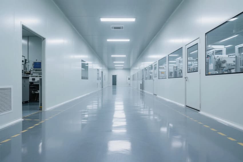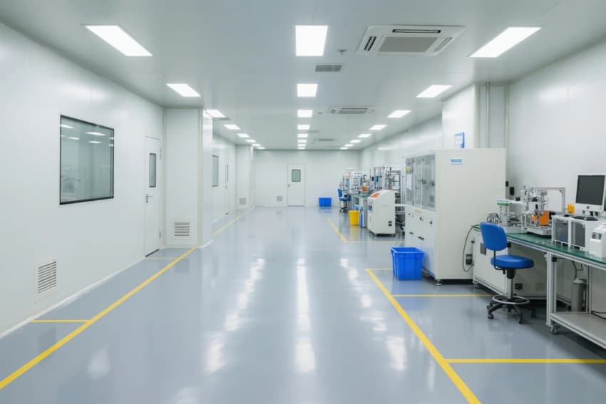 本工程严格依据ISO14644-1Class7洁净标准,采用"工业4.0"设计理念,打造智能化电子光伏生产环境。主体结构采用模块化洁净室系统,50mm厚深灰抗菌彩钢板墙体与浅灰防静电环氧自流平地坪形成未来工业美学基调,表面电阻稳定控制在10^6-10^9Ω范围。