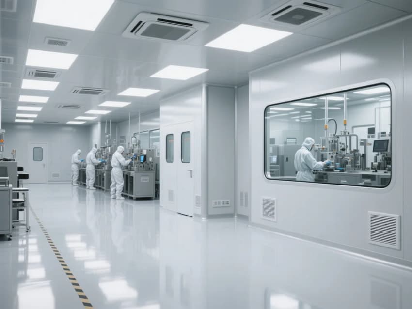 智能控制系统集成环境监测(温湿度/洁净度/压差)、设备联动和能源管理三大模块,通过墙装LED智能看板实现数据可视化。照明系统采用600x1200mm洁净平板灯,照度维持800Lux±10%,重点工位增设局部黄光照明。工程整体通过模块化设计、智能化控制和标准化施工,实现电子光伏厂房在洁净度、能效比和生产效率的最优平衡。
