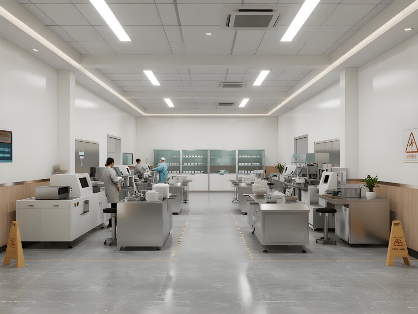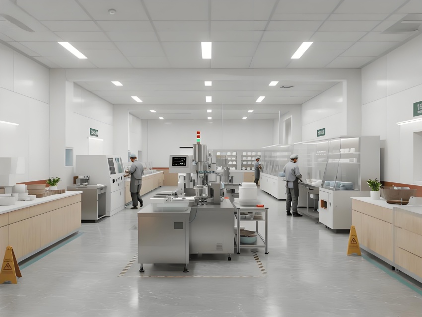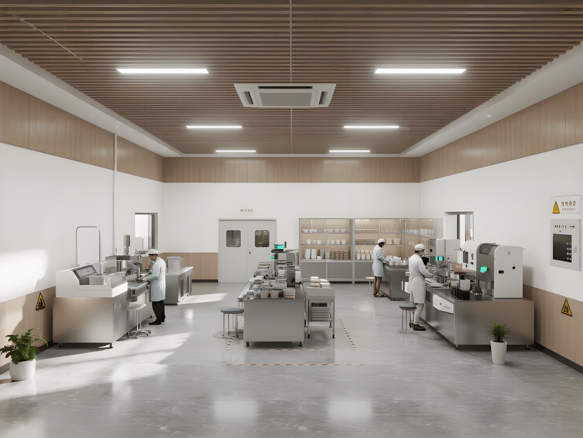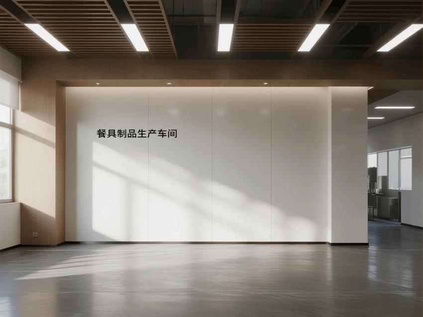 本餐具制品车间设计以现代简约工业风为核心,融合高效生产与视觉舒适性。色调以纯净白(墙面)、浅木色(仓储柜)和不锈钢银灰(设备)为主,营造清爽专业的氛围。