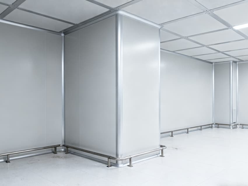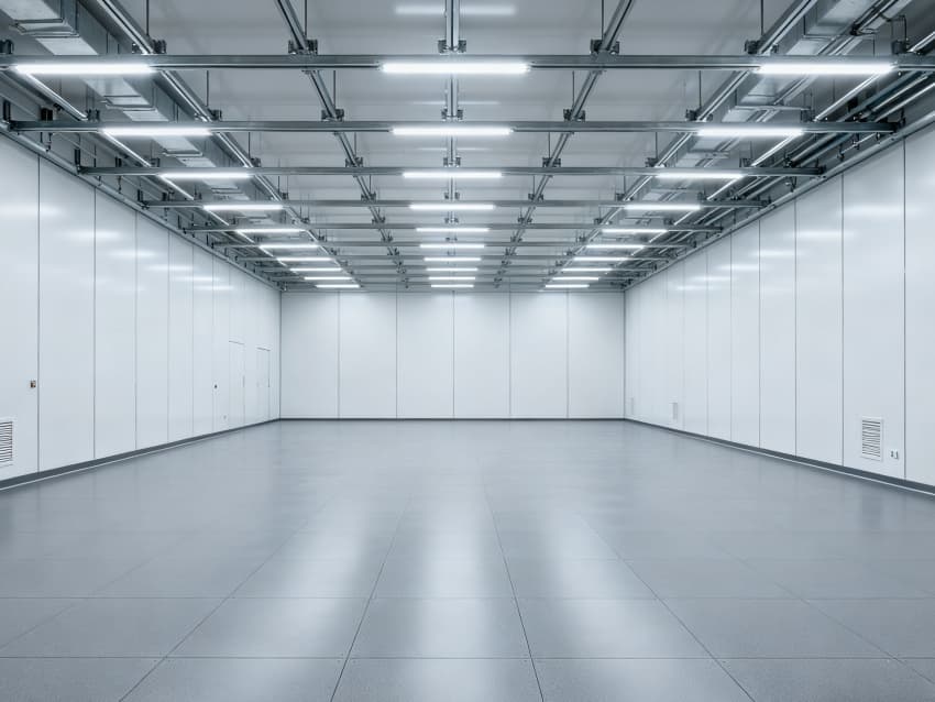 内部按功能划分为六大核心区域:洁净生产区采用无设备空旷布局,预留8-12米柱距满足光刻机、刻蚀机等大型设备安装需求;管线集成区通过规整的顶部管线桥架系统,实现水、电、气、真空系统集中管控,减少管线交叉干扰;洁净缓冲区设置于生产区入口,搭配墙面通风口保障洁净度过渡;设备预留区保留开阔横向空间,支持后期工艺动线调整;结构辅助区通过角落加固设计,满足重型设备承重需求;墙面洁净区采用光滑防污材质,降低粉尘附着率。整体空间兼顾半导体生产的洁净标准与功能灵活性,适配合肥半导体产业发展需求。