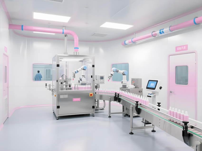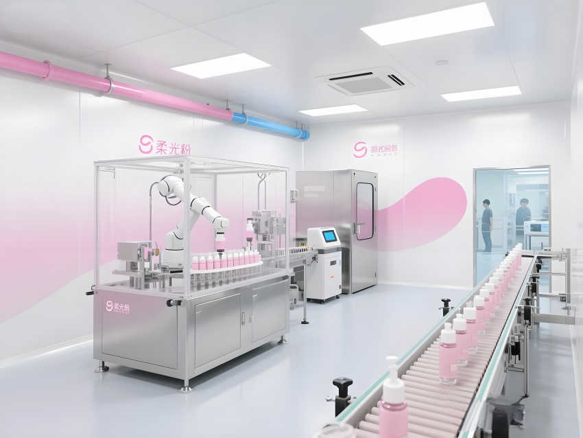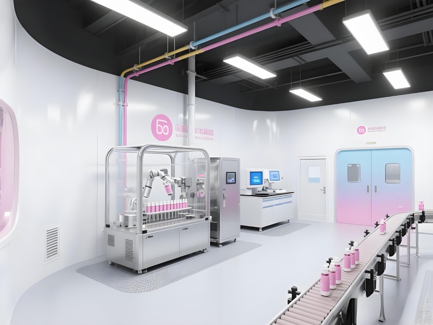 本车间以“科技感纯净美学”为设计语言,将化妆品行业的精致基因融入工业空间。纯白主色调搭配品牌标志性的柔光粉点缀,墙面圆弧过渡的彩钢板与地面浅灰导静电地板构成洁净基底。核心灌装区透明层流罩内,机械臂精准抓取瓶体灌装,冷银色设备与粉色功能标识形成视觉对比。顶棚均匀分布的LED平板灯在乳化区投下无影光效,原料输送管道通过色环编码清晰区分。质检实验室的蓝光检测仪与包装区高速传送带上的产品流,共同构建高效生产韵律。人员通道的智能风淋室采用渐变色玻璃,科技感与人性化并存。整体空间通过严格的功能分区与柔和的色彩管理,打造符合国际标准的化妆品智造殿堂。