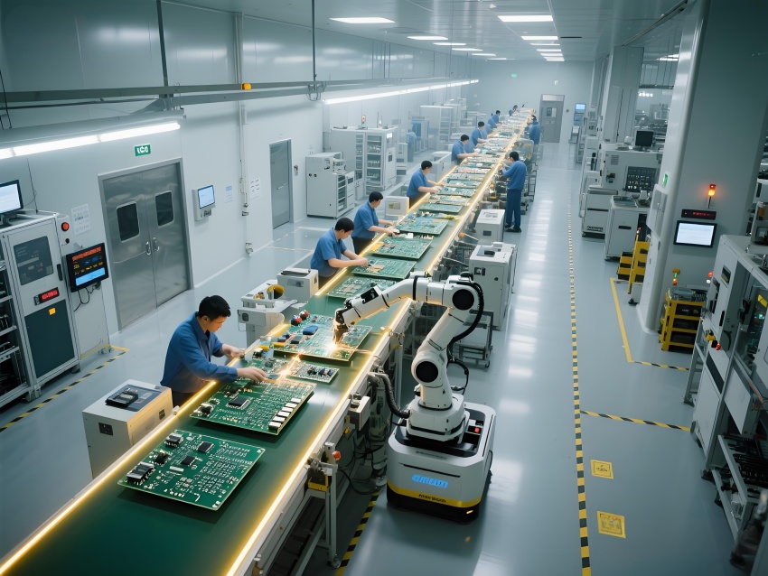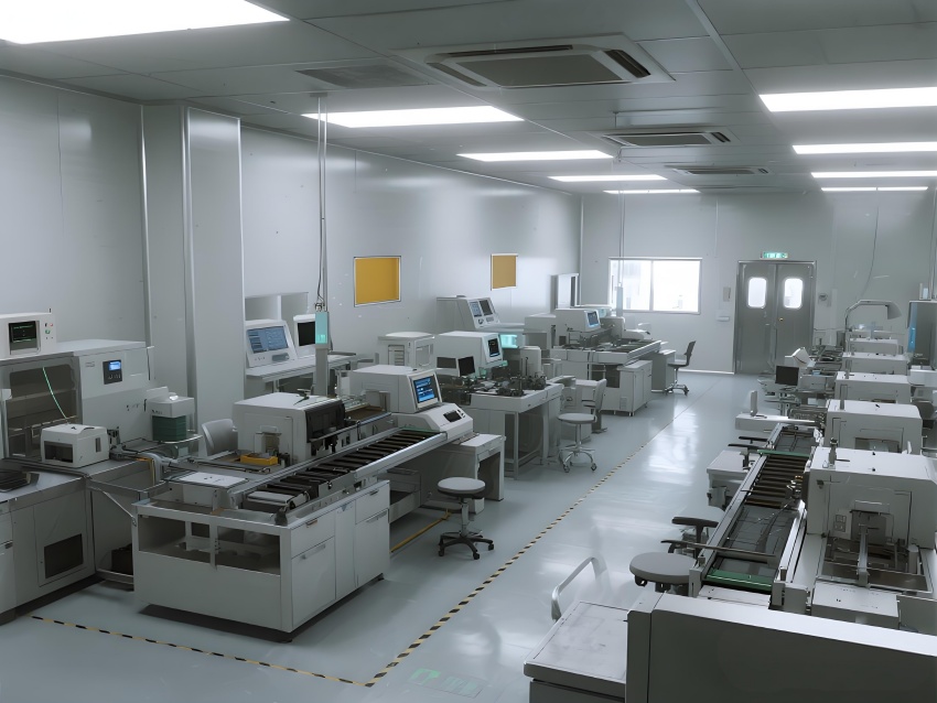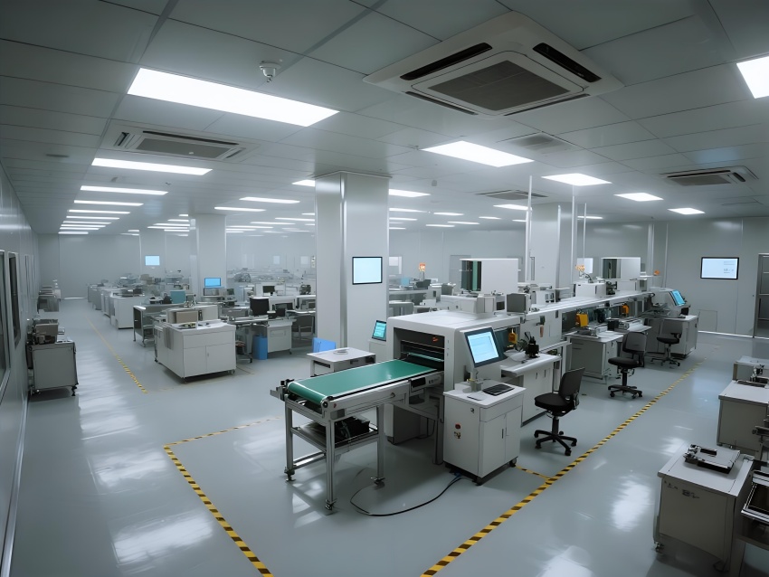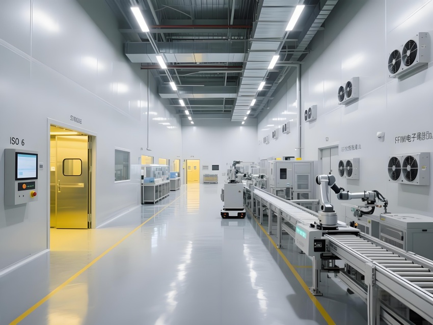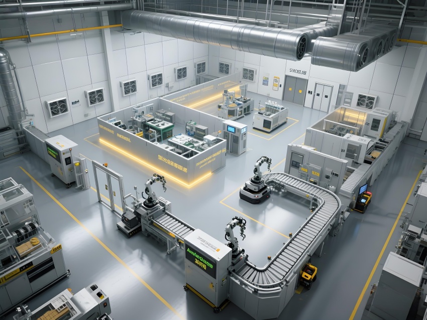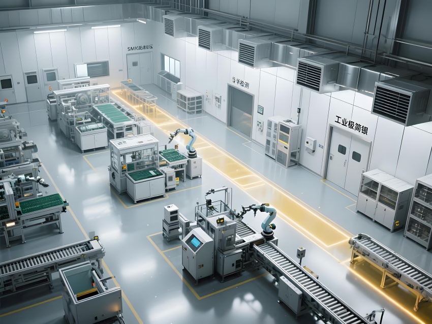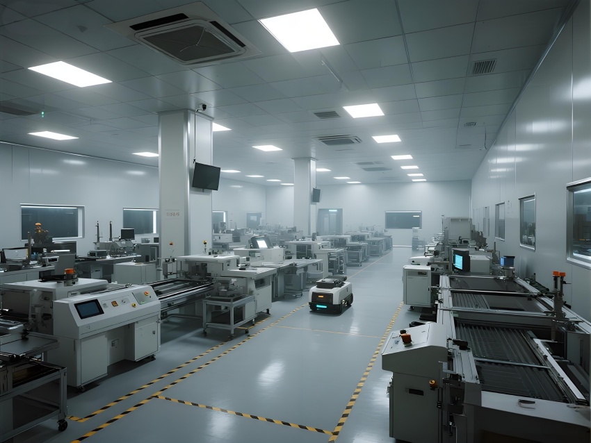 本车间以"精密工业美学"为设计主题,构建银灰色主调的科技制造空间。顶棚矩阵排列的FFU单元形成蜂巢状光影,与地面荧光绿流线导向标识构成三维洁净动线。防静电环氧地面嵌入铜丝导电网,墙面采用阳极氧化铝板与可视压差监测窗。核心SMT区配备全自动悬吊式贴片机群,红色激光校准射线在设备间交织。黄光作业区采用琥珀色漫射照明,与普通区的冷白光形成鲜明功能区分。透明亚克力防尘帘分隔各工序段,AGV机器人沿蓝色磁轨无声穿梭。数据看板悬浮显示实时良率与温湿度参数,顶部螺旋风管配合地面回风口形成垂直层流。整体通过金属冷质感与智能交互元素的碰撞,打造兼具工业严谨性与未来科技感的精密制造环境。