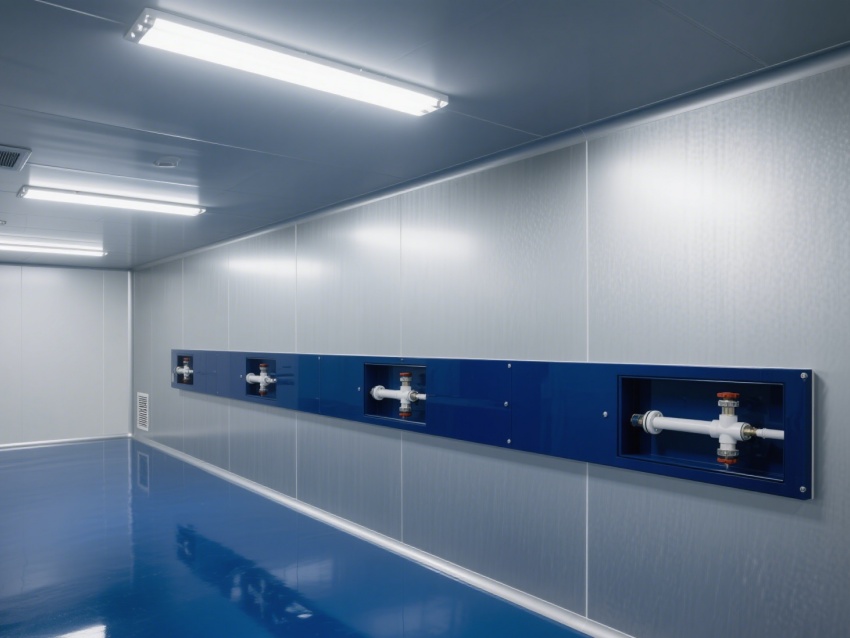 车间内部整体呈银灰色和蓝色,给人一种现代感和科技感。墙面、地面和天花板均采用无缝设计,便于清洁和消毒,防止灰尘和微粒的积聚。照明系统明亮且均匀,提供了良好的工作环境。