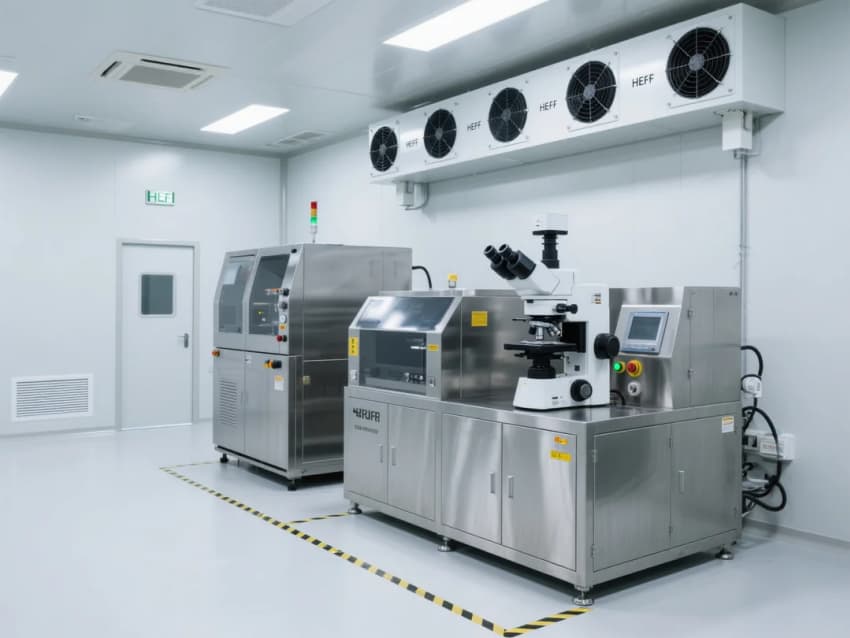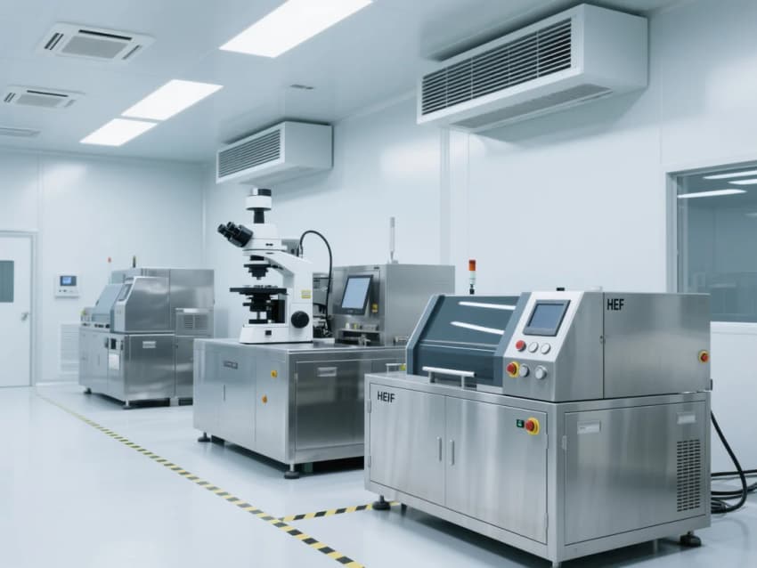 天花采用模块化FFU(风机过滤单元)系统,配合高效HEPA过滤器,维持稳定的气流组织与洁净度。设备区采用浅灰色不锈钢围挡,与白色洁净墙面形成视觉区分,同时便于日常清洁维护。嵌入式LED无影灯带提供均匀照明,减少作业阴影。整体设计强调功能性、安全性与可持续性,满足电子光学制造的高标准环境需求。