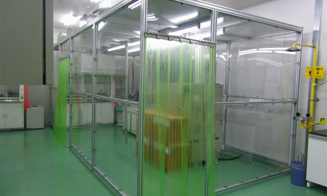洁净棚采用工业铝材(或不锈钢方通、铁方通喷塑)作为框架,风机滤网机组(ffu)送风,四周悬挂防静电垂帘(或有机玻璃),其内部净化级别可达到100-10000级。适用于操作区内局部净化级别要求高的区域。