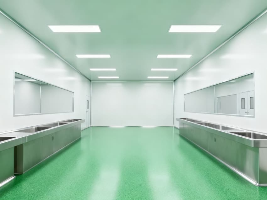 材料是无尘车间的“基础骨架”,选型需兼顾洁净性、兼容性与耐用性,杜绝“隐性污染”。地面材料优先选用防静电环氧自流平或PVC卷材,表面平整度误差需≤2mm,且具备无孔隙、抗磨损、易清洁特性——环氧地坪需分三次涂刷,每层干燥后检测厚度,总厚度控制在1.5-2mm,确保无针孔、无气泡;PVC卷材接缝需热焊处理,焊缝宽度≥10mm,避免缝隙积尘。墙面与吊顶选用0.8mm厚彩钢板,芯材导热系数≤0.03W/(m・K),表面光滑无颗粒脱落,拼接处采用企口式设计,拒绝普通密封胶(易老化脱落),改用专用洁净密封胶,且胶缝宽度均匀控制在3-5mm。门窗需选用气密型平移门,配备自动闭门器与双层密封胶条,玻璃采用钢化中空Low-E玻璃,既能保障密封性,又能减少结露与能耗。