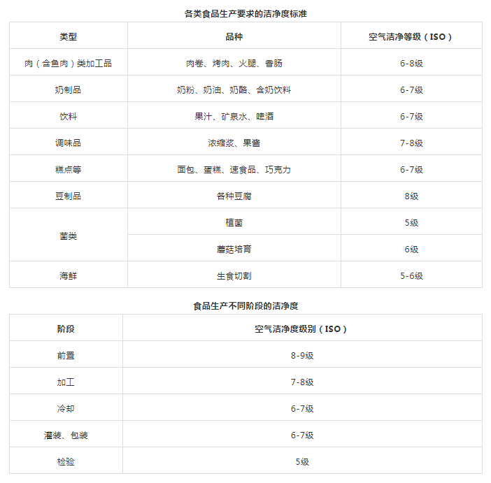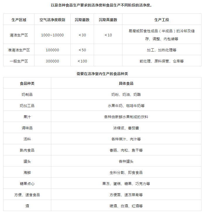 3、清洁作业区(洁净室):指卫生环境要求最高,人员、环境要求较高,必须经过消毒和更衣才可以进入,如:原料、成品裸露的处理区域,食食品的冷加工间、即食食品的冷却间、待包装即食食品的储存间、即食食品的内包装间等。食品厂不同生产区域和空气洁净度等级