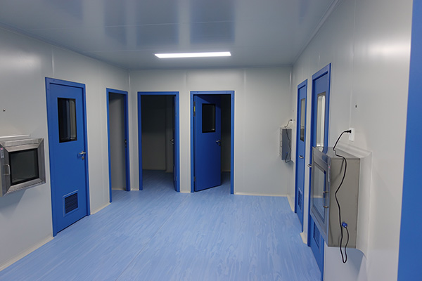 2、间隔:用双面彩钢保温板围护及间隔,围护面到天花顶,洁净走廊及车间间隔处做通透铝合金半玻璃窗,窗台高900mm,玻璃厚8mm,高1200mm,玻璃窗高平门高度(2100mm),铝合金窗料用特制净化材料,45度斜边,与地面及天花交角做元弧及阴角接口,符合规范及卫生消毒要求。