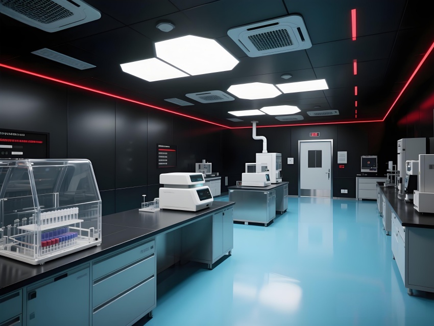 本实验室采用"生物防御未来主义"风格,通过锐利的几何切割与警示色彩构建科研防护美学。核心实验区以哑光黑墙面搭配红色应急光带,形成视觉危险预警,与清洁区的