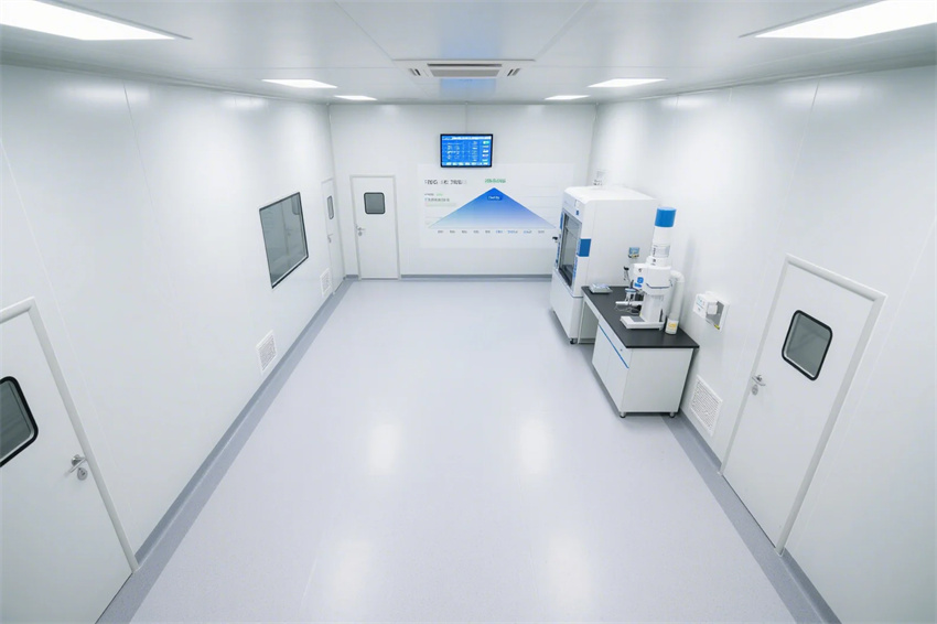 本工程严格依据ISO14644-1Class6(千级)洁净标准及GMP规范要求,采用"科技极简"设计理念,打造高标准的微生物检测环境。主体结构采用模块化洁净室系统,50mm厚纯白医