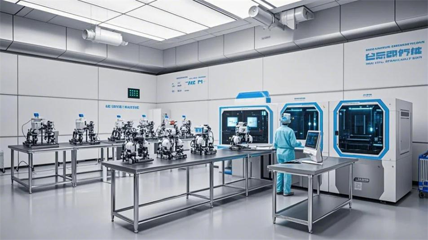 机械人研发实验室,未来科技风格。实验室分为研发区、测试区、装配区和办公区。研发区占50%,测试区占30%,装配区占10%,办公区占10%。研发区:防静电环氧地坪(浅灰色),