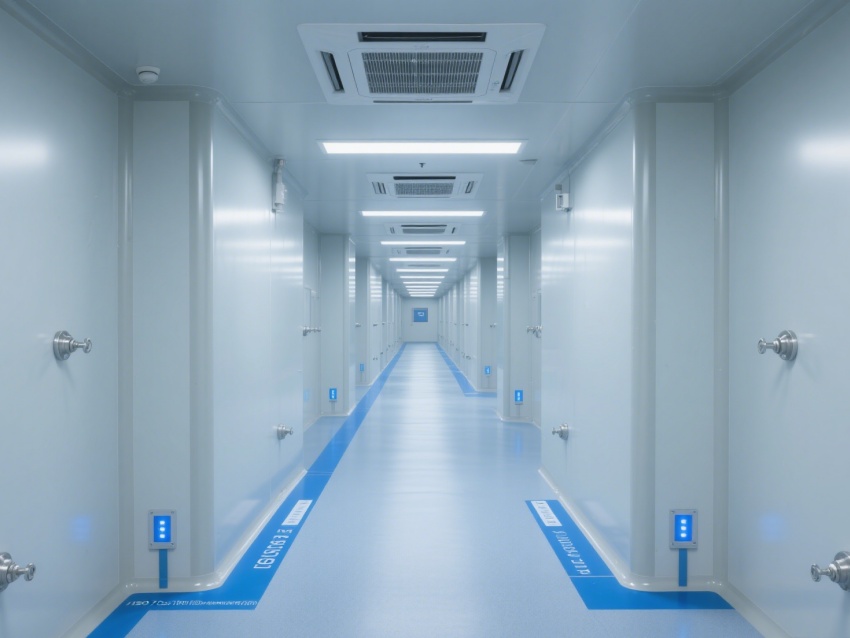 走廊采用一体化洁净设计,地面蓝色标识线清晰规划动线,各类管线与设备布局兼顾功能性与美观性。整体工程通过材质选用、空气净化、智能监控的协同,为芯片检测提供了超洁净、高稳定的专业环境,有力保障芯片检测的精度与可靠性,是芯片研发与质量把控的核心技术支撑单元。