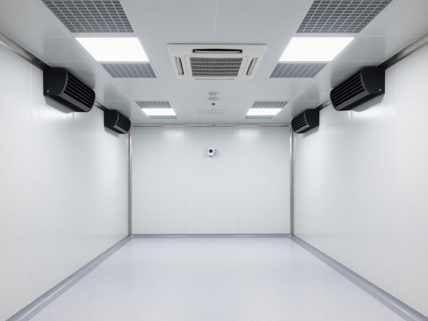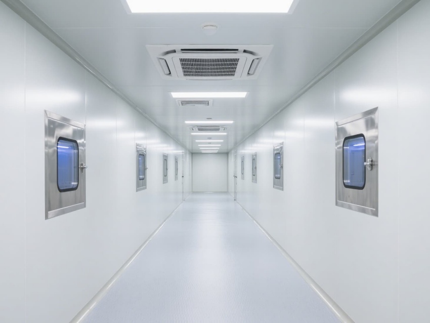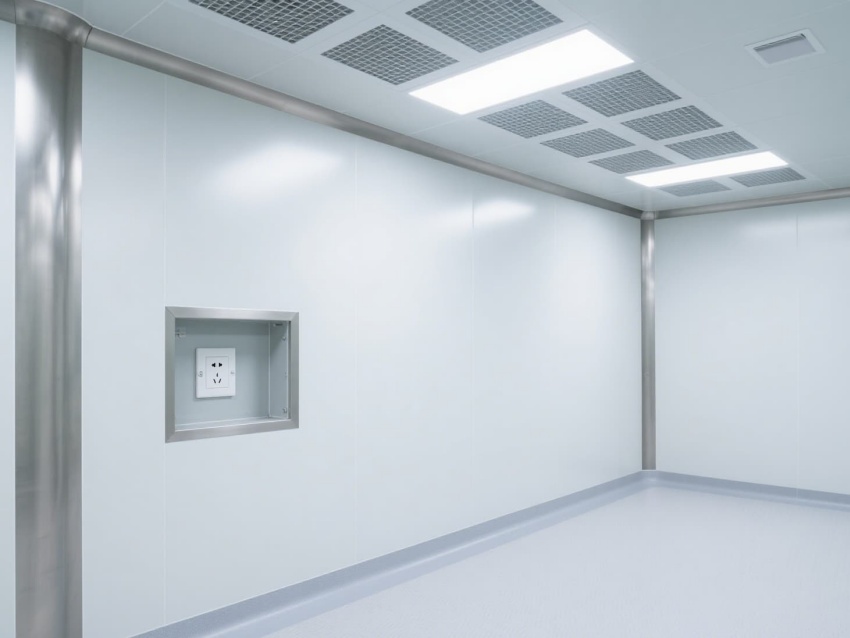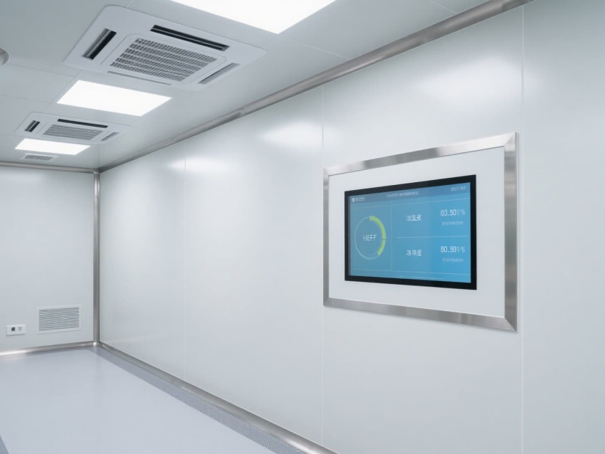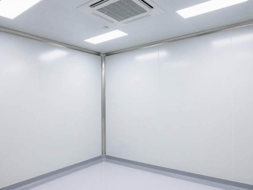 车间以白色抗菌彩钢板为主体建材,搭配浅灰防静电地坪,墙面与地面的圆弧过渡设计消除卫生死角,便于彻底清洁消毒。顶部嵌入式高效送风口形成垂直层流,配合侧下回风系统,实现每小时15-25次的空气置换,持续维持洁净正压。